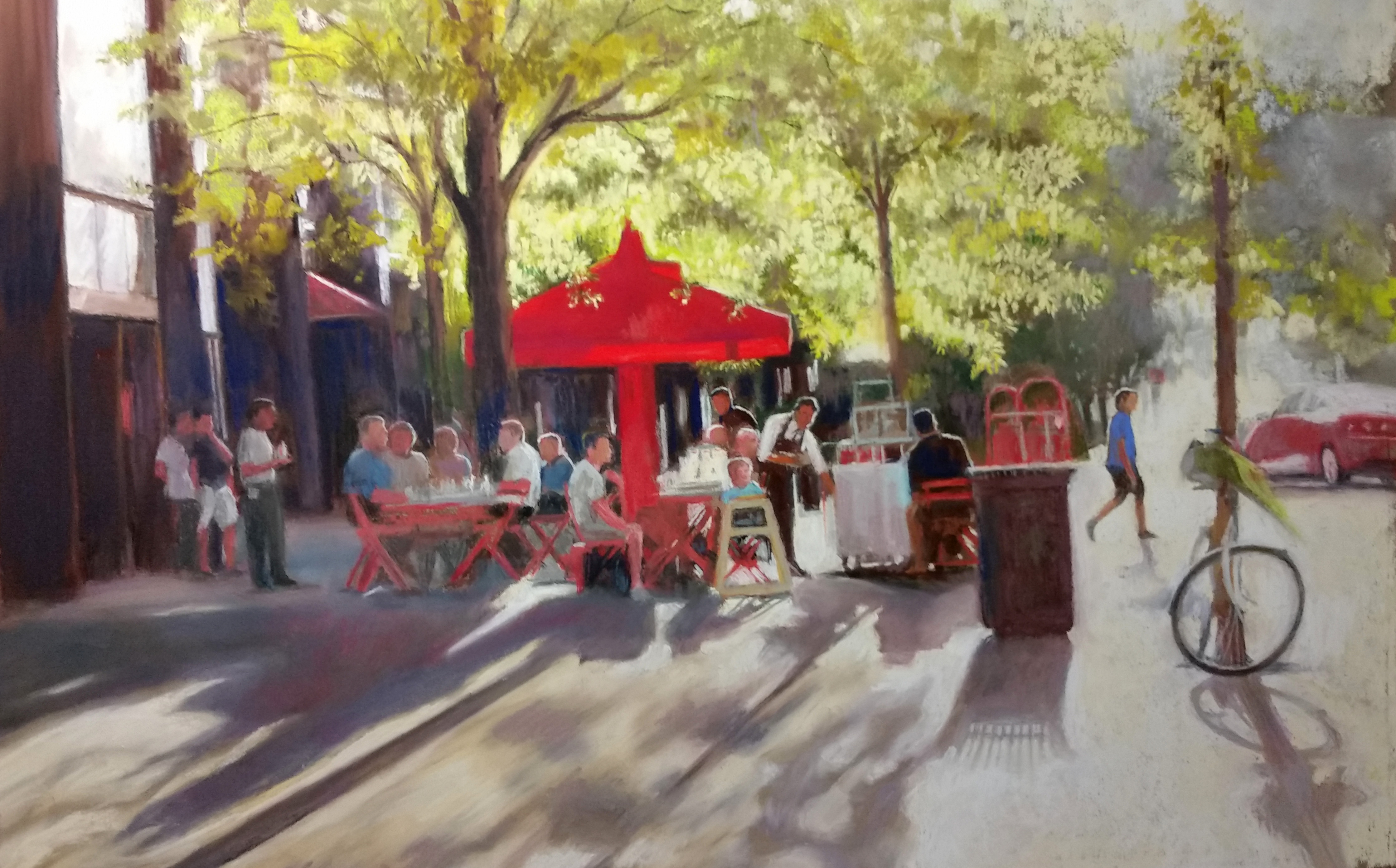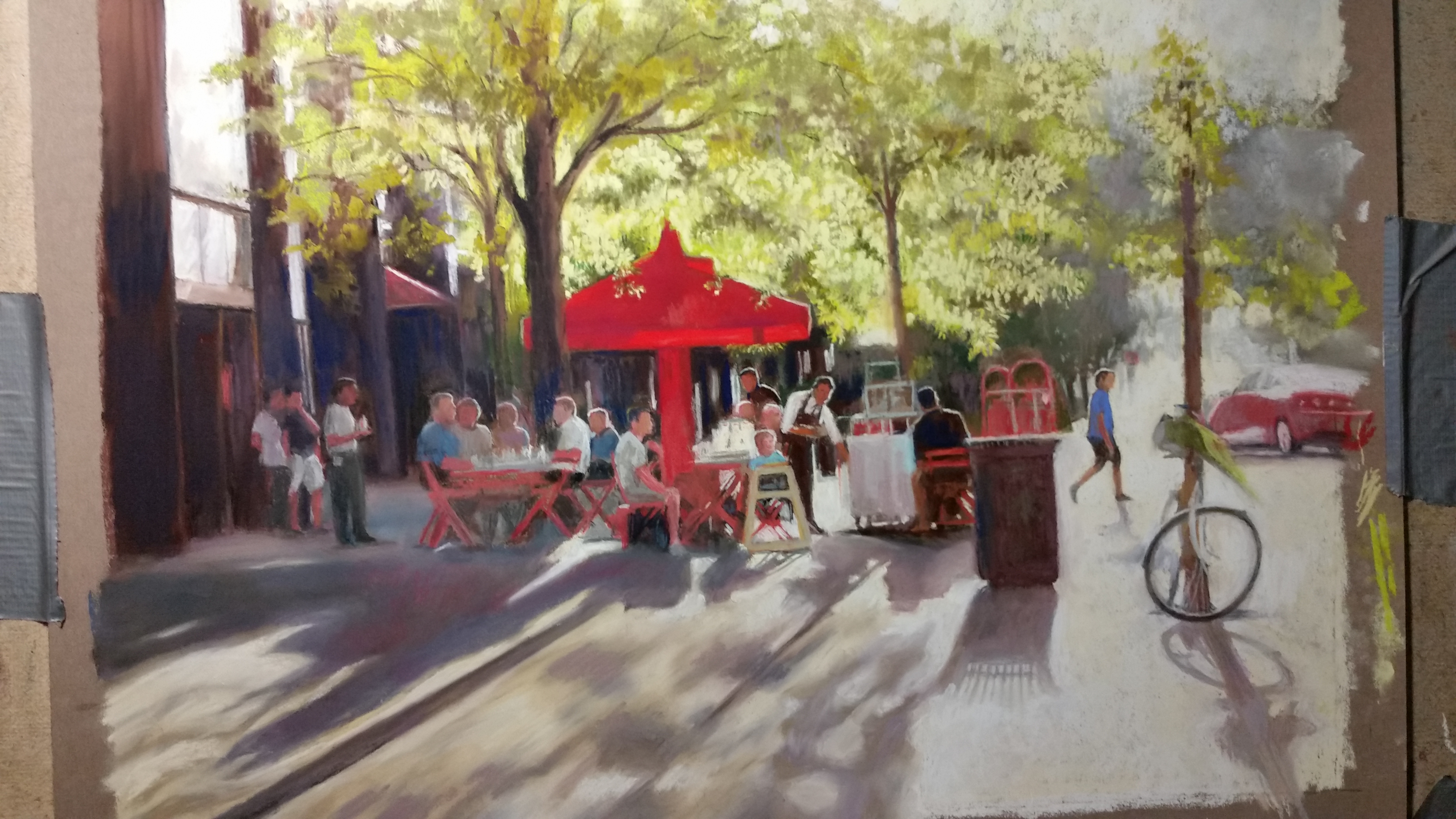 At this stage of the painting, my challenge is whether to put more detail in people’s faces, or leave it the way it is with the focus on the late afternoon lighting; the sun coming from behind the trees, also bleaching out the sidewalk on the right hand side casting long shadows in the foreground. I may simplify the leaves in the upper portion of the painting.