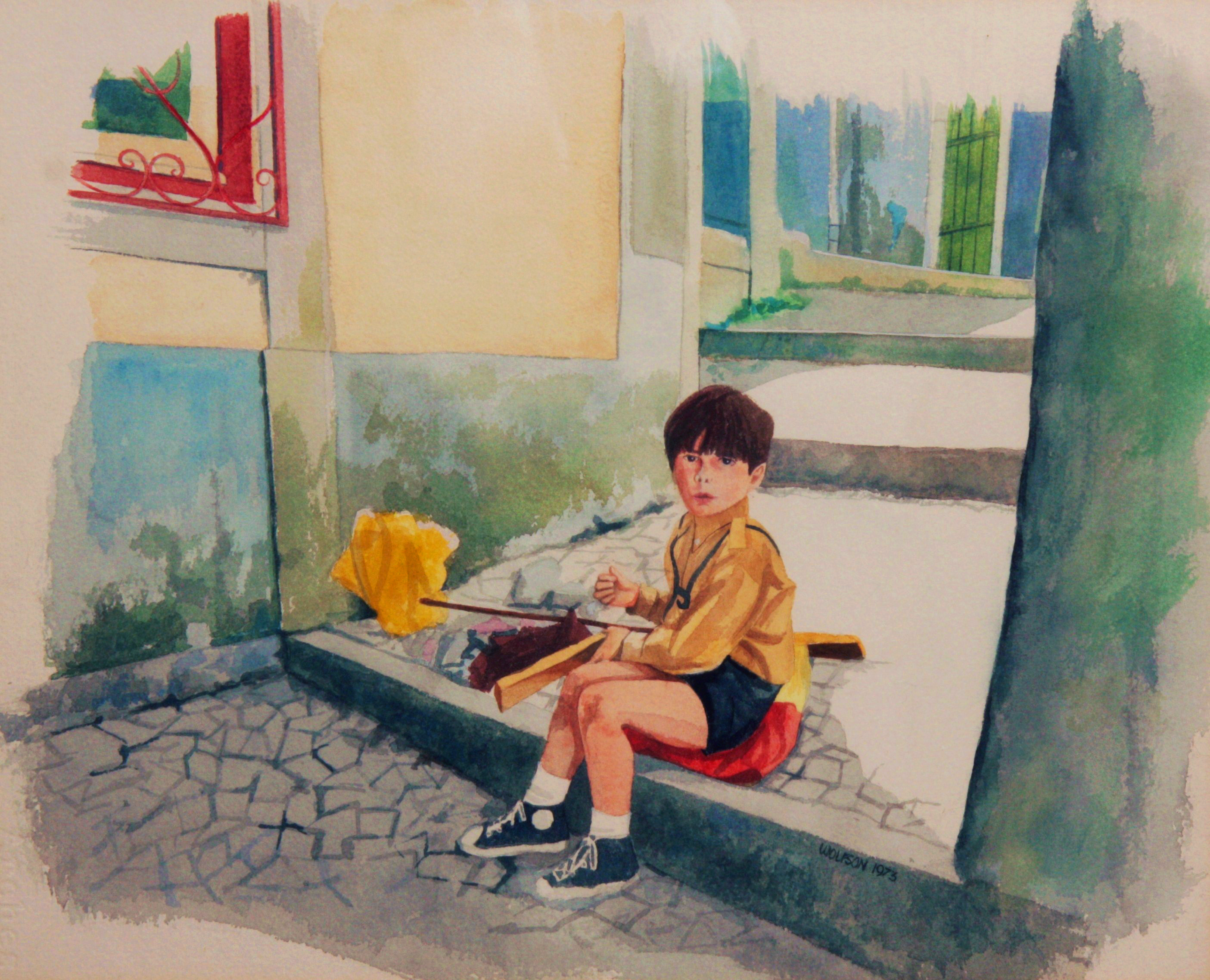 WATERCOLOR of a young boy playing in Portugal.